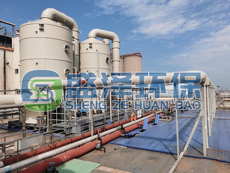噴淋塔主體材質(zhì)為PP,堿洗塔內(nèi)置有填料(PP),氣液接觸比表面積大。循環(huán)液通過噴淋,均勻分布至填料層,充分和廢氣接觸,優(yōu)化氣液比。洗噴淋最上端噴淋組件的上部設有除霧器,廢氣穿過循環(huán)液噴淋層后,再連續(xù)流經(jīng)除霧器(PP絲網(wǎng))時,除去廢氣中所含液滴。堿噴淋塔設有二級噴淋,增加處理效果。