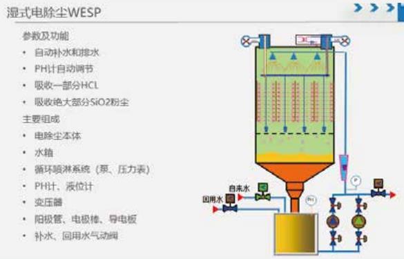 光纖行業(yè)等工藝制程產(chǎn)生的大量極細(xì)微(亞微米)粉塵或顆粒物 (如SiO2)、氯化氫(HCL)、氟化氫(HF)、氯氣(CL2)或其它 污染物通過濕式高壓靜電除塵進(jìn)行處理,達(dá)到國家排放 標(biāo)準(zhǔn)后排放。濕式高壓靜電除塵器具有去除效率高、運(yùn)行費(fèi)用低、耐腐 蝕、多種污染物同時(shí)去除等優(yōu)點(diǎn),廣泛應(yīng)用于光纖、半導(dǎo)體、化工、面板等行業(yè)。