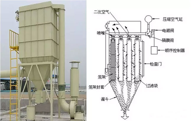 脈沖布袋除塵器的結(jié)構(gòu)構(gòu)成如上圖,主要由上部箱體、中部箱體、下部箱體(灰斗)、布袋、龍骨、噴嘴、清灰系統(tǒng)和排灰機構(gòu)等部分組成。