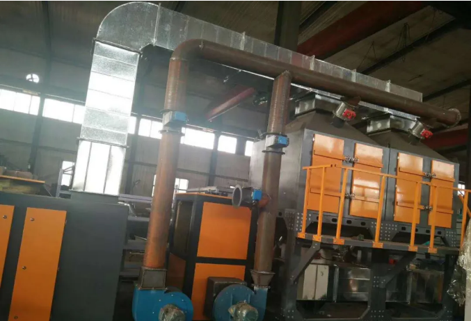 這種屬于比較基本的流程工藝,由于催化劑都有一個主要原理是有機廢氣的溫度在100℃以下并且濃度較低的情況下,這種情況熱量一般是不能自給的,因此需要在進入反應器之前,需要在預熱室內(nèi)對其進行加熱升溫。一般所采用的預熱方式主要有煤氣或電加熱,這二種方式可以將廢氣升溫到催化反應所需要的起燃溫度,從而達到燃燒氧化分解的目的,燃燒氧化后的氣體在熱交換器內(nèi)和沒有處理的廢氣進行熱交換,從而可以回收部分的熱量。
